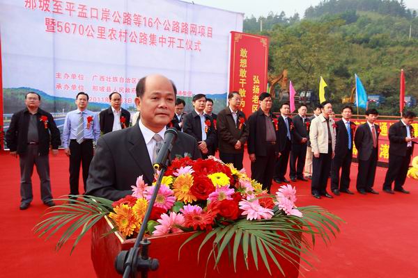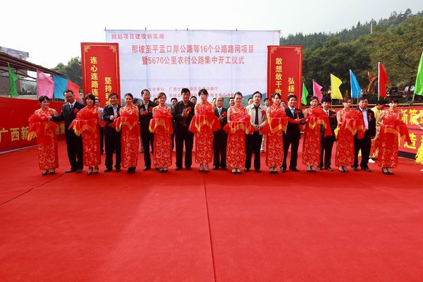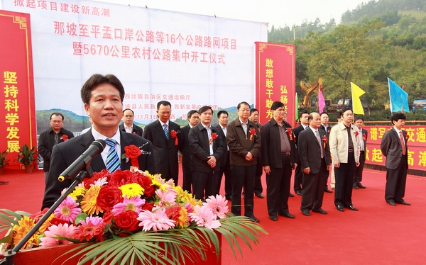為貫徹落實自治區(qū)黨委、政府在全區(qū)掀起項目建設(shè)新高潮的決策部署,沖刺第四季度,完成全年公路建設(shè)目標(biāo)任務(wù),自治區(qū)交通運輸廳于11月3日舉行全區(qū)公路路網(wǎng)改造項目集中開工儀式。由集團公司承辦的分會場——那坡至平孟口岸公路等16個公路路網(wǎng)項目暨5670公里農(nóng)村公路集中開工儀式在百色市那坡縣德隆鄉(xiāng)隆重舉行。自治區(qū)交通運輸廳紀(jì)檢組長、廳黨組成員朱名勝,百色市市委常委、政法委書記周武紅,市人大常委會黨組成員黃五同,集團公司黨委書記、董事長朱堅和、總經(jīng)理李定倫、黨委副書記張友坐、副總經(jīng)理劉明洪、總工程師覃炳賢,自治區(qū)公路管理局、百色市公路管理局、交通運輸局、那坡縣四家班子、集團公司直屬各單位領(lǐng)導(dǎo)及有關(guān)部門負責(zé)人等出席開工儀式。