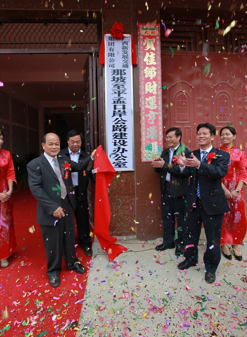自治區(qū)交通運輸廳紀(jì)檢組長、廳黨組成員朱名勝(左一)、集團公司董事長朱堅和(右二)等領(lǐng)導(dǎo)為項目建設(shè)辦公室揭牌