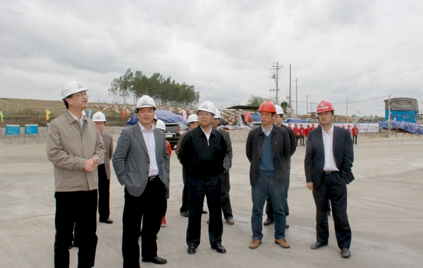 圖為:交通運輸廳副廳長梁毅(右二)、崇左市委書記趙樂秦(右三)、崇左市副市長張鴻(左一)在項目現(xiàn)場檢查調(diào)研
