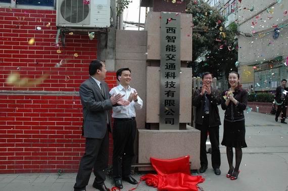 圖為:自治區(qū)交通運(yùn)輸廳副巡視員符茂清(右二),集團(tuán)公司副總經(jīng)理劉明洪(左二)為廣西智能交通科技有限公司成立揭牌