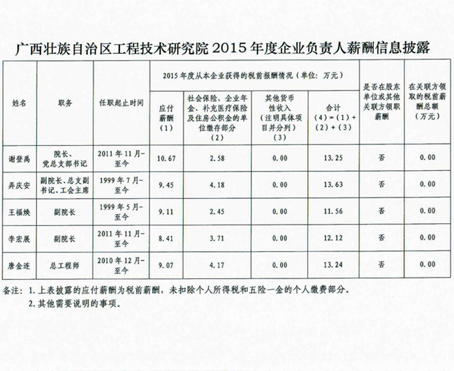 廣西壯族自治區(qū)工程技術(shù)研究院2015年度企業(yè)負責人薪酬信息披露
