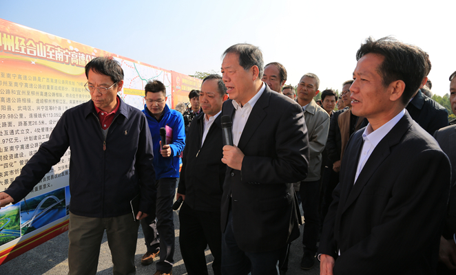 在柳州經(jīng)合山至南寧高速公路(簡稱新柳南高速公路)開工現(xiàn)場會主會場上,集團(tuán)公司黨委書記、董事長朱堅和向自治區(qū)人民政府副主席陳剛、自治區(qū)交通運(yùn)輸廳副廳長梁毅等與會領(lǐng)導(dǎo)介紹了新柳南高速公路項目情況,以及集團(tuán)公司目前承建的自治區(qū)重大建設(shè)項目鐘山至來賓、來賓至巴馬、融水至河池等3個縣縣通高速公路項目建設(shè)情況,朱堅和表示,集團(tuán)公司致力于成為自治區(qū)黨委、政府最可信賴的交通基礎(chǔ)設(shè)施投資運(yùn)營力量,全力以赴完成各重大項目建設(shè)任務(wù)。