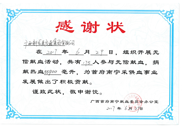 南寧獻血管理委員會充分肯定了新發(fā)展交通集團黨員群眾踴躍參與獻血,積極投身公益事業(yè)的行為,并向集團公司贈送了感謝狀。